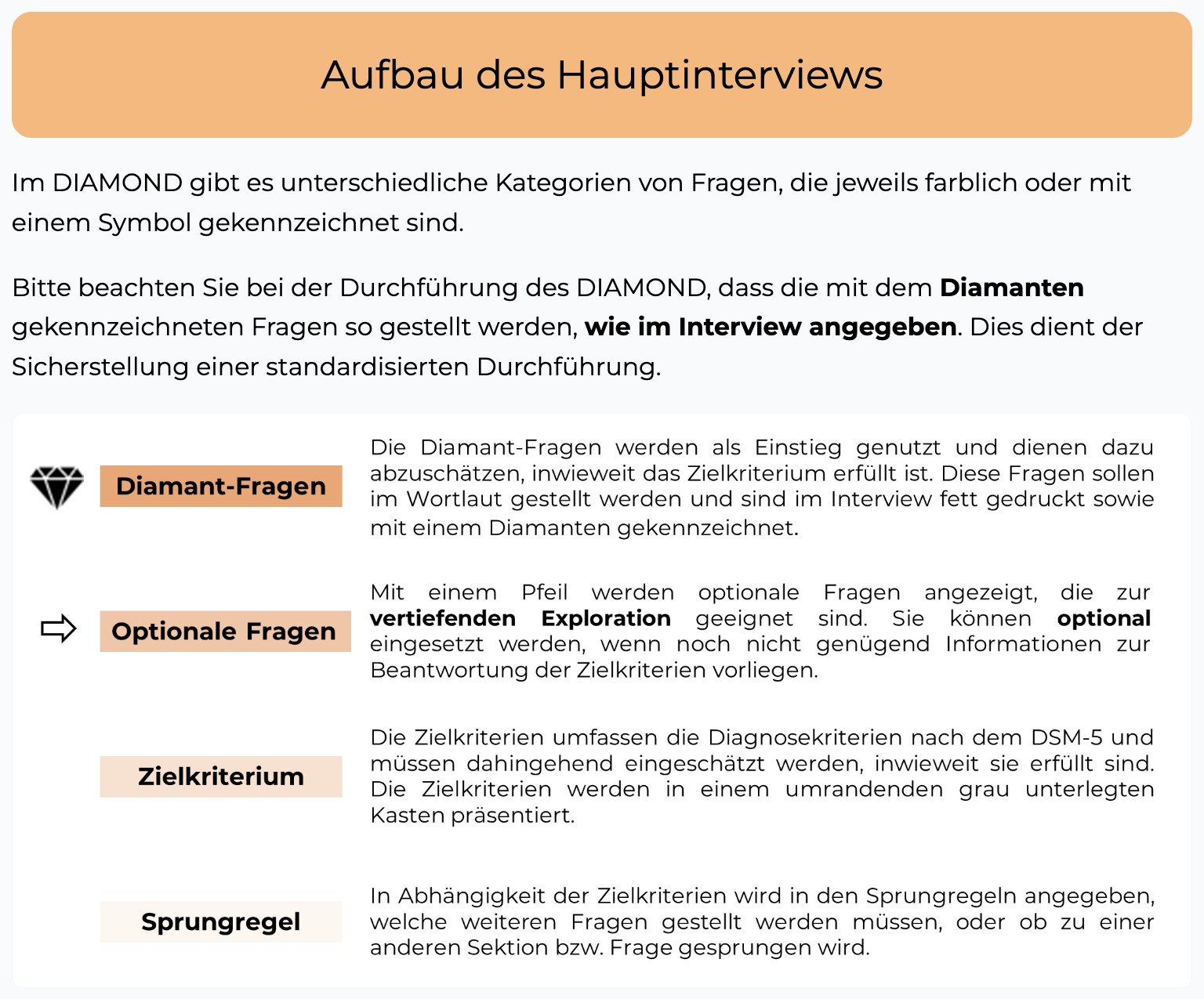 Das DIAMOND ist ein halbstrukturiertes Interview, welches zur Diagnostik von psychischen Störungen nach den DSM-5 Kriterien bei Erwachsenen ab 18 Jahren eingesetzt wird.