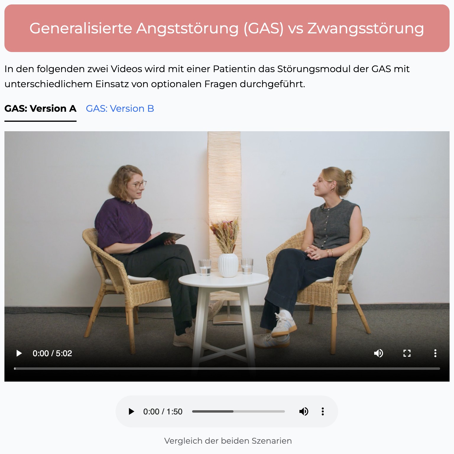 Hier sehen Sie exemplarisch Ausschnitte aus den Lerneinheiten 2 (Hauptinterview und Störungsmodule) und 3 (Differentialdiagnostische Überlegungen) anhand von Bildmaterial und einer beispielhaften Durchführung eines Störungsmoduls.